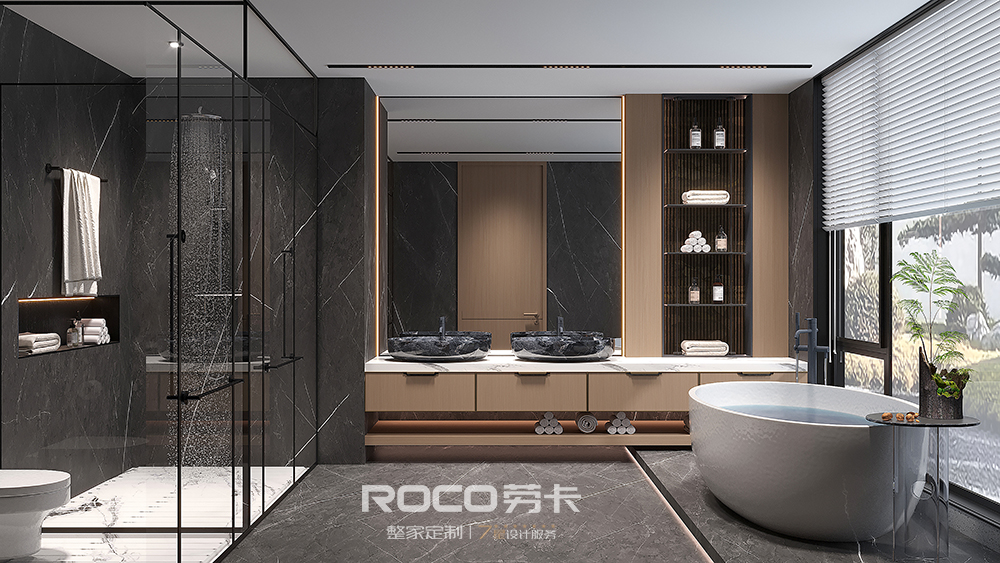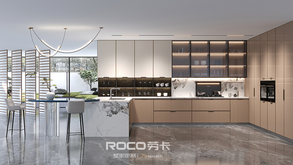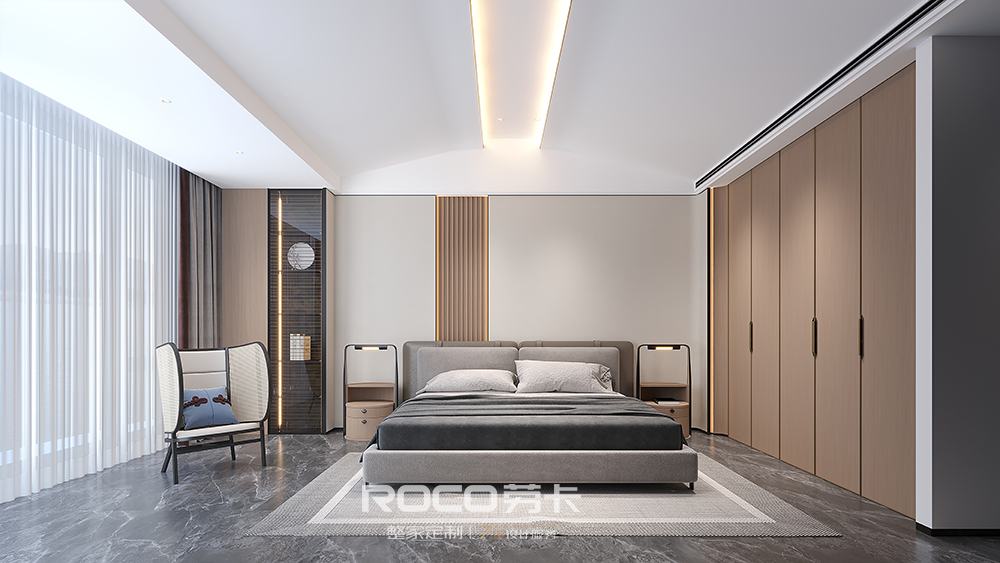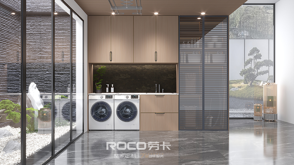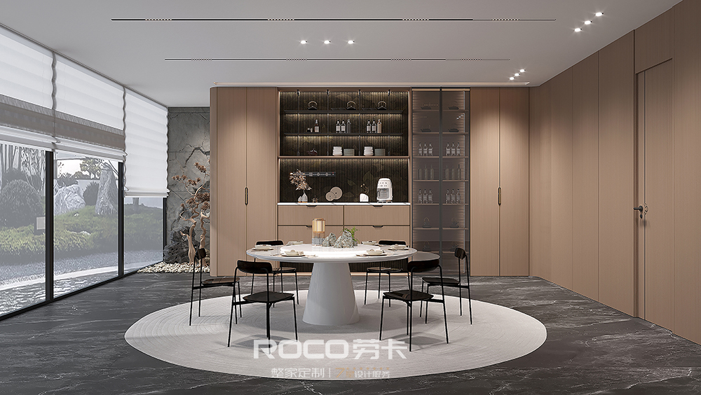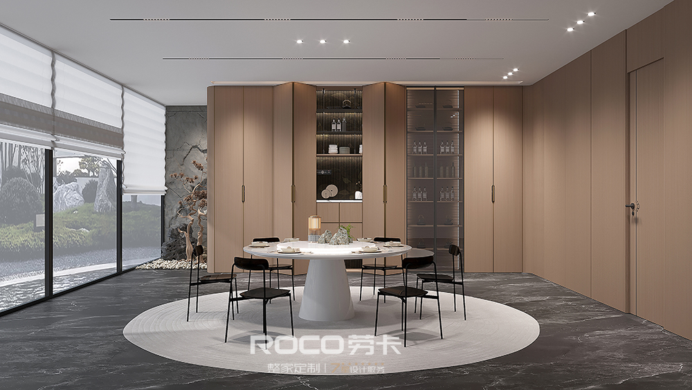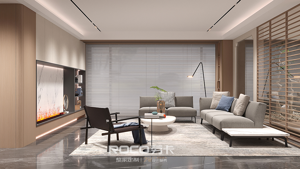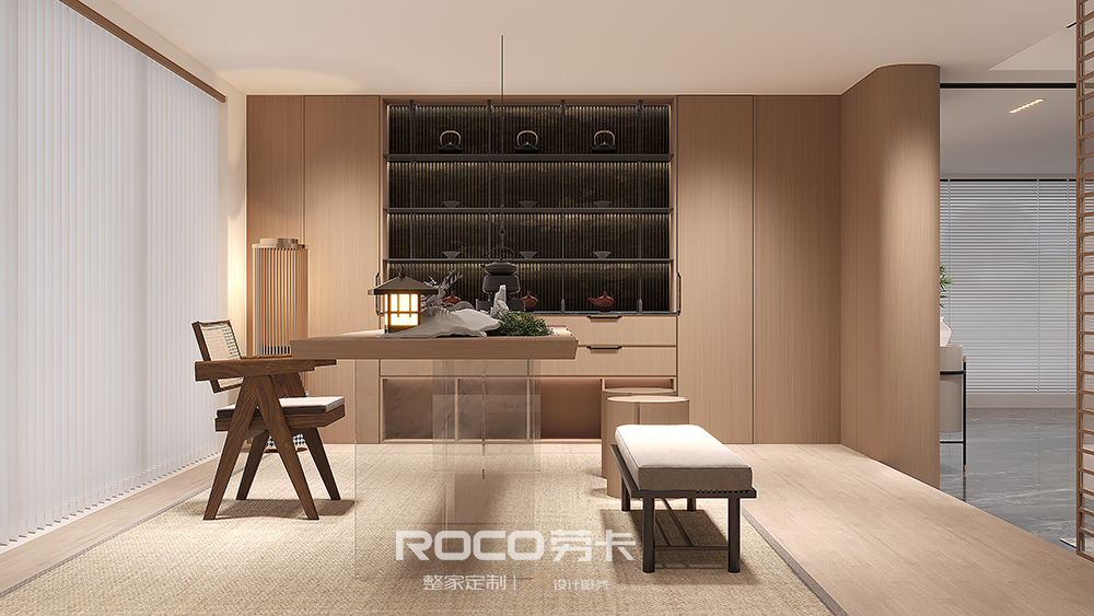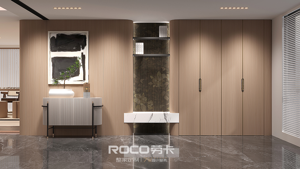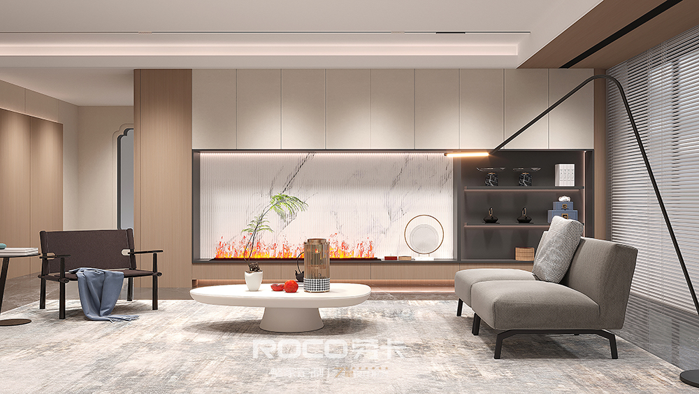 以中性偏灰的自然木纹色为主调,AG·尊时凯龙(中国区)人生就是搏!融入海棠花元素,使用现代设计手法,摒除传统中式的深沉、厚重之感,以新时代审美打造简洁明快的新中式风空间美感。